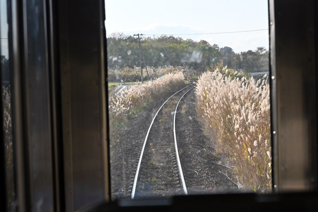 途中、ススキが銀色に光って見事でした。それにしても、この列車の運転手さんは女性でしたが、飛ばすこと、飛ばすこと。速度は70km/hくらいでしょうが、最後尾に立っていて上下動が怖かったです。